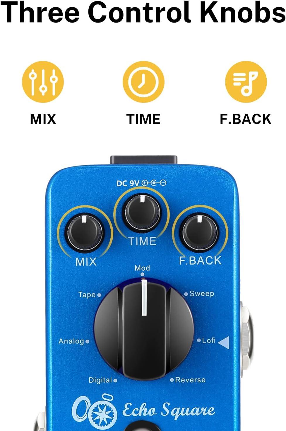 [Wide delay range]: Wide delay time controls suitable for both warm and pure mode; LEVEL Knob: Control the wet signal level; F.BACK Knob: Control the delay feedback. Time of Delay: 20ms ~ 300ms