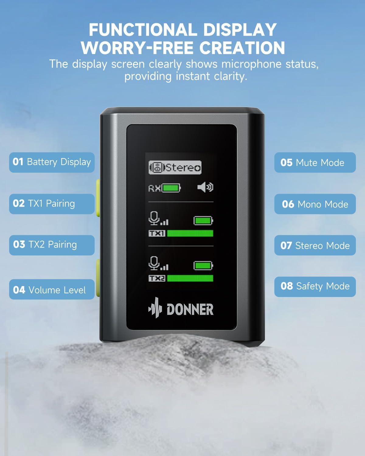 [Ultra Portable, with Newly Functional Display] VPM-20 owns new-upgraded unprecedented functional display which makes your adjustments at a glance. It features portability and extensive compatibility. Two Lavalier Microphones are only 9g in weight and 29mm in diameter each. It's equipped with 3.5mm TRS interfaces for camera, compatible with various camera devices. The plug-play let you start creating without worry.