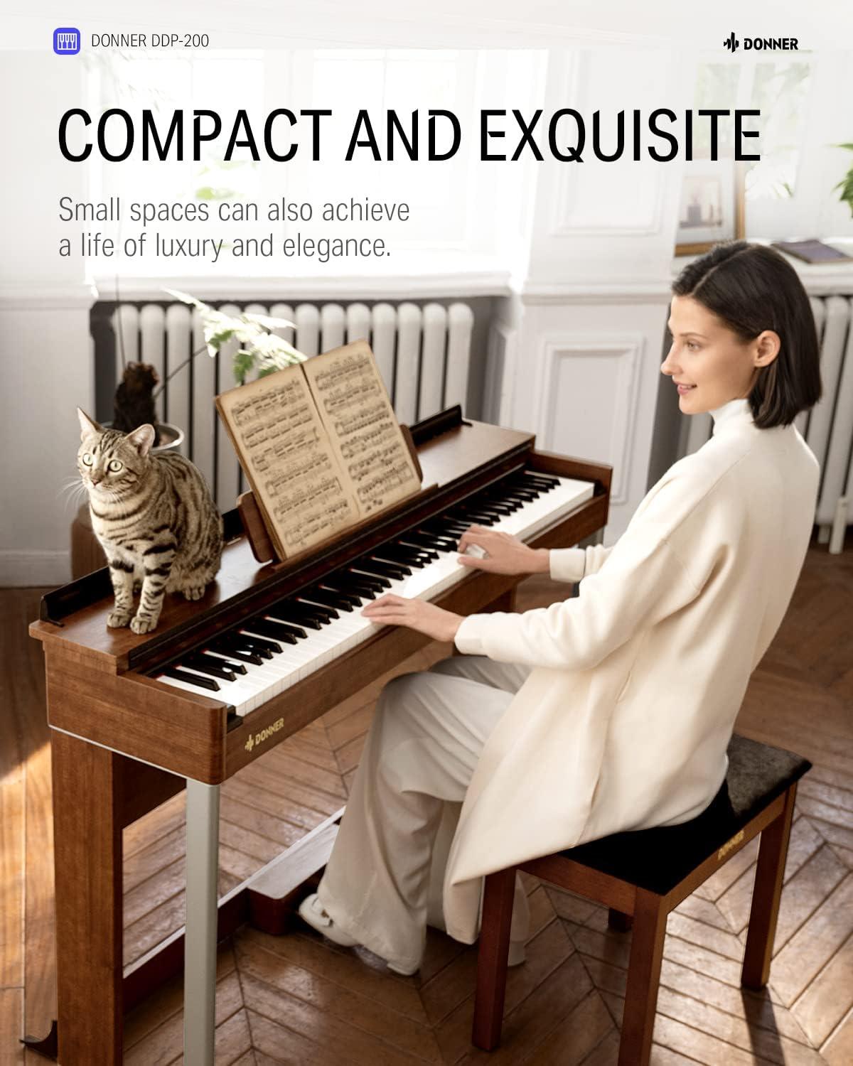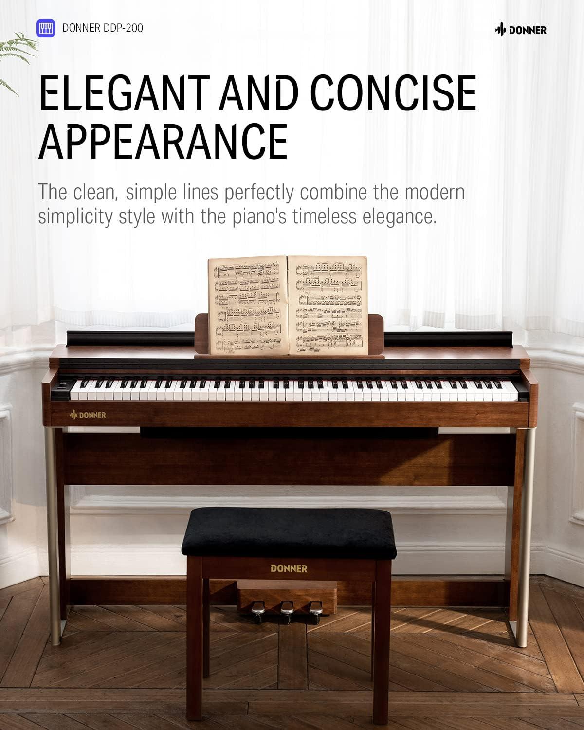 【Appealing Wood Grain Finish】Donner DDP-200 88 key digital piano features appealing wood grain body finishes and rich dark oak colors. The incredibly light-luxury home style is simple to match with contemporary interior design. It's a light, expensive, and attractive musical instrument as well as a gorgeous piece of furniture.
