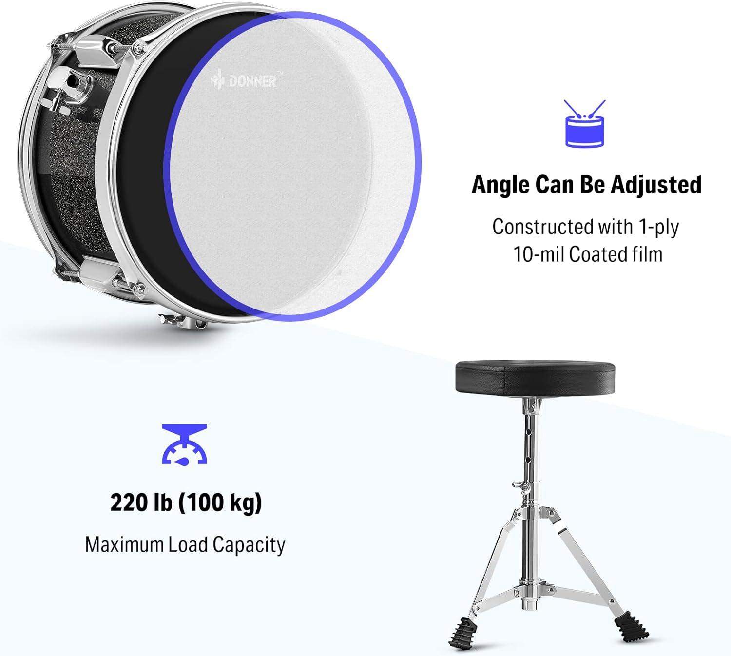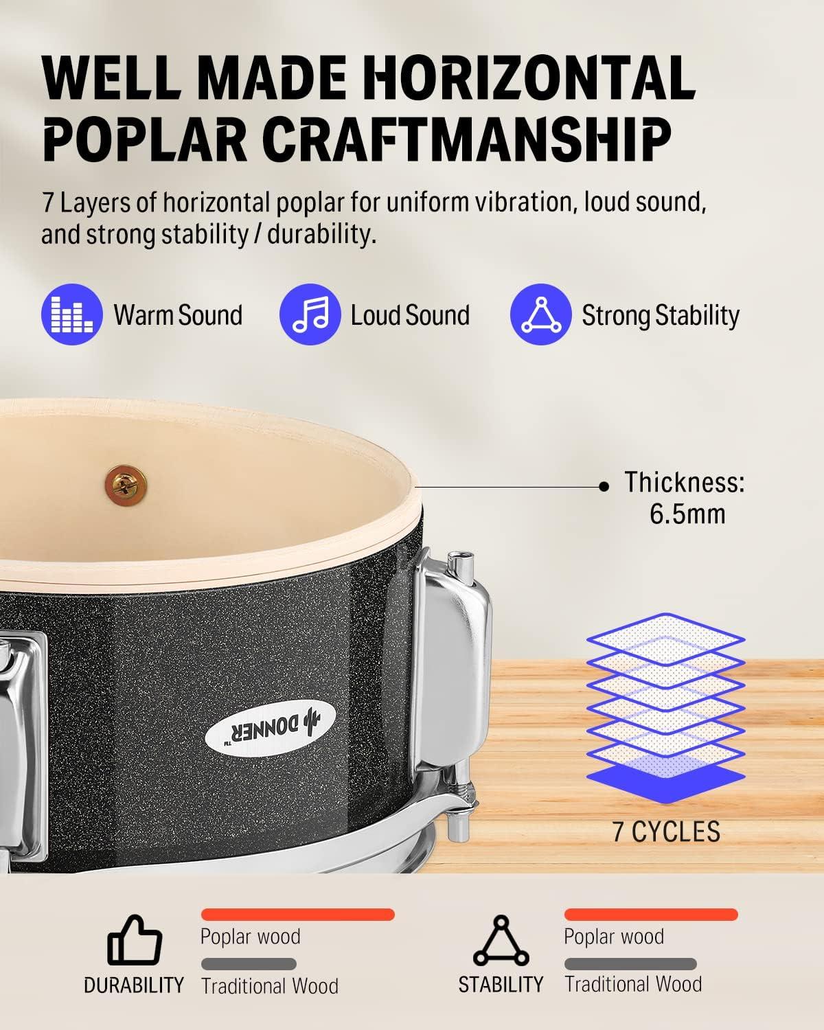 [Perfect Junior Durm Set] Donner EDS-220 is perfect for aspiring young musicians ages 3-10 years old. Package including 14” x 10” bass drum x 1.6”x 4” fixed tom x 1.8”x 4” fixed tom x 1.8”x 4” fixed snare drum (with stand) x 1.12”x 8” floor tom x 1.8” hi-hat (with stand) x 1.10” straight cymbal (with stand) x 1, 5A wooden drum x 2, small wooden drum x 2, bass pedal x 1, circular cushion adjustable drum seat x 1