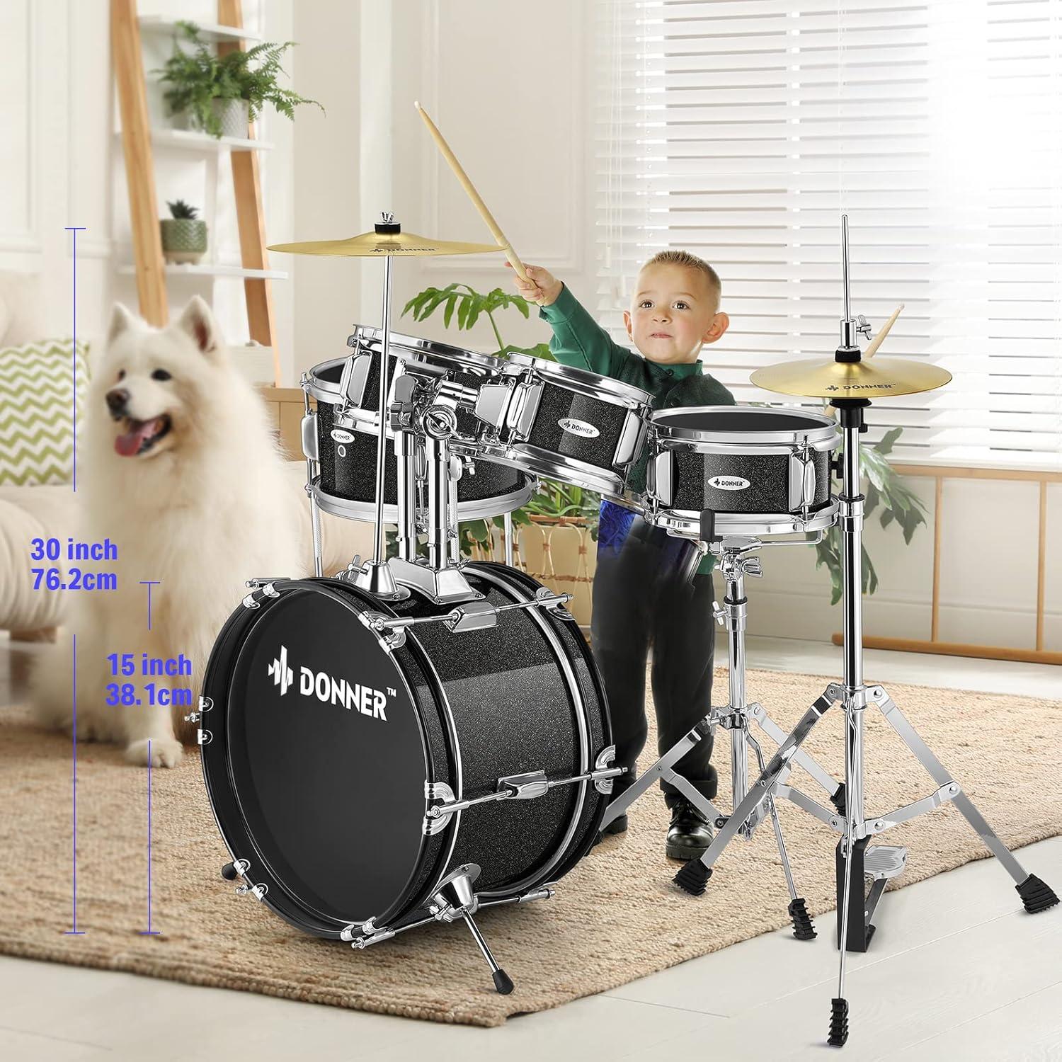 Kid Drum Sets-Donner 5-Piece for Beginners, 14 inch Full Size Complete Junior Drum Kit with Adjustable Throne, Cymbal, Hi-Hat, Pedal & Drumstick, Metallic Black(Metallic Black)